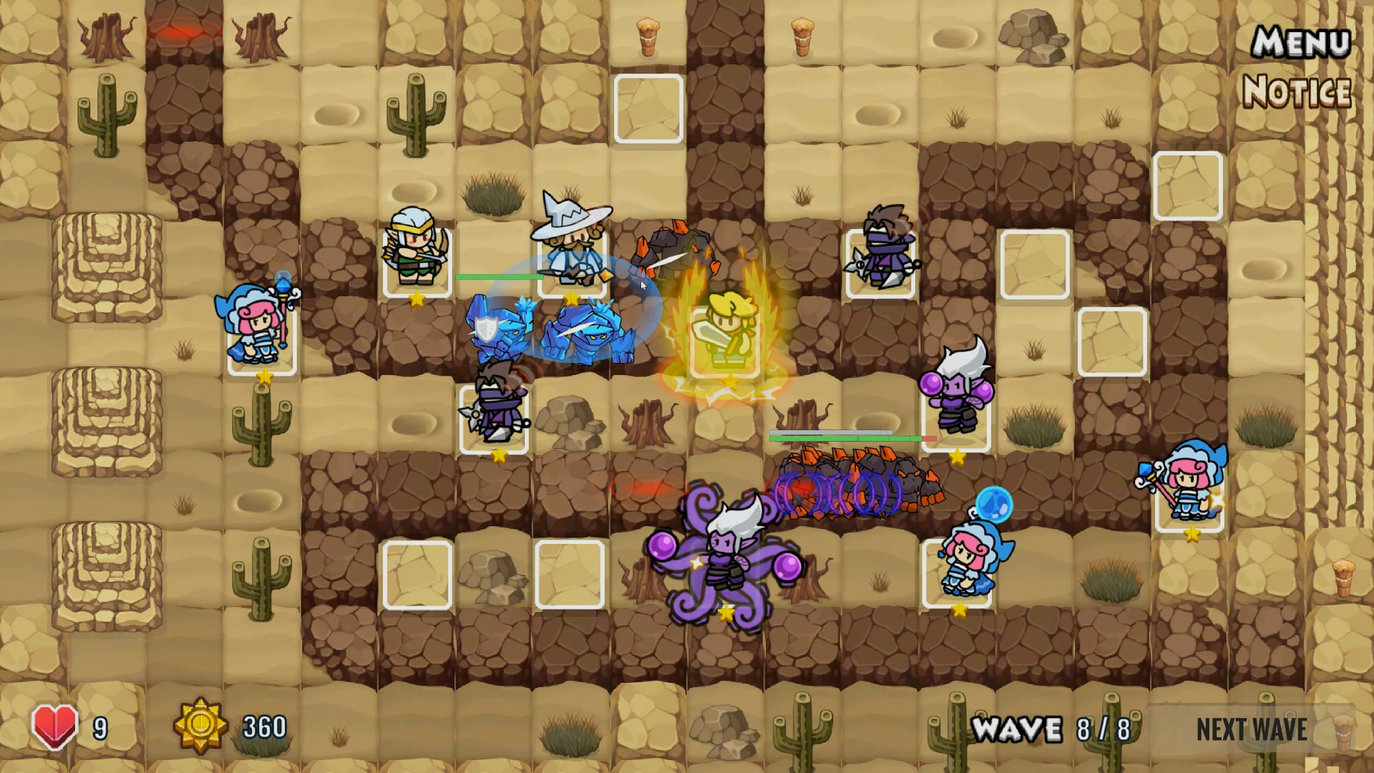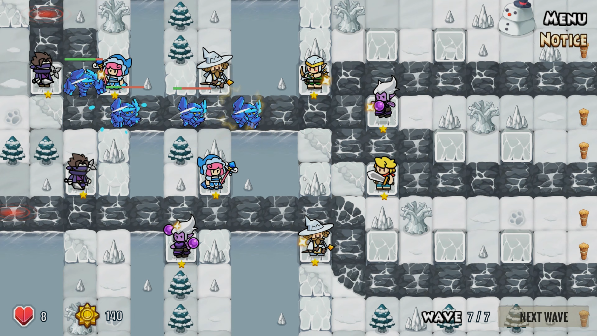 The difficulty curve progresses gradually, introducing new enemies and mechanics step by step to enhance the challenge. Core gameplay revolves around tower swapping and skill rotations, with strategic depth stemming from how players adapt their tower placements to counter enemy mechanics.